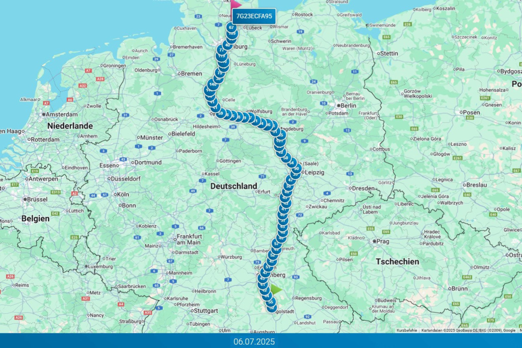 Kuchl (A) – Ingolstadt (D) – Bad Segeberg – über Dänemark und die Storebeltbrücke und Öresundbrücke nach Schweden – Halmstad (S) – Vänern See – Trollhättan – Saggrenda (N) – 2233 km