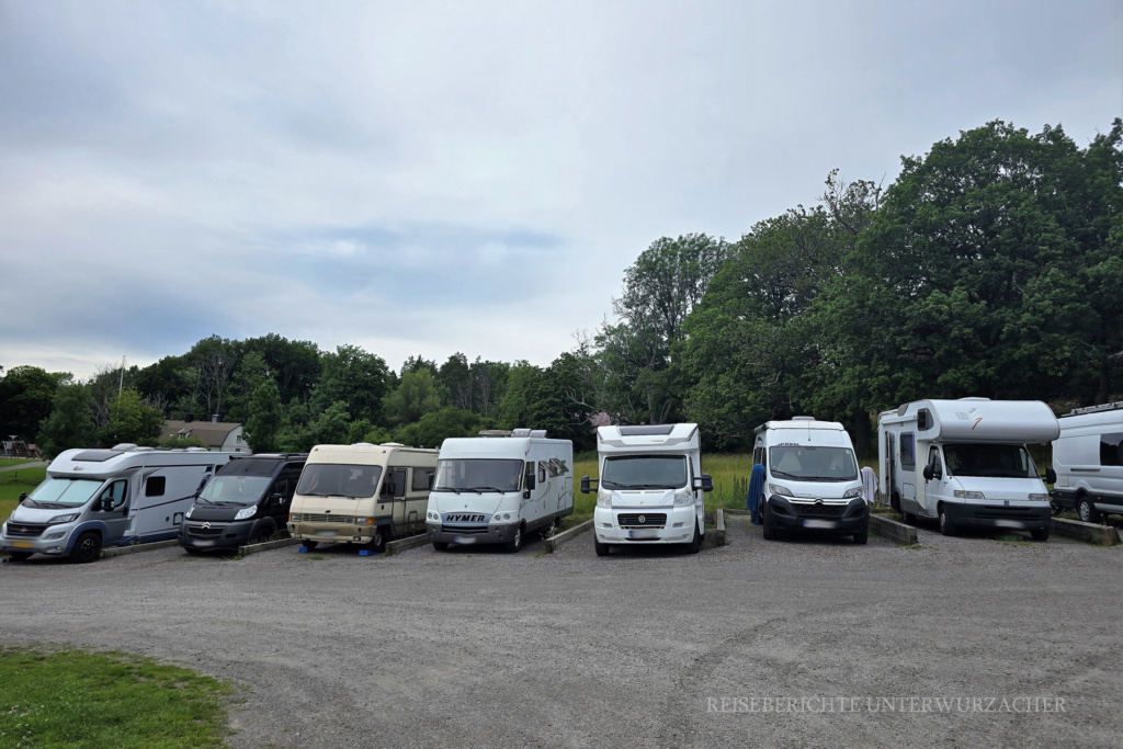 Erst nach dem Mittagessen setzen wir unsere Reise fort. Wir fahren am Meer entlang nach Norden und parken am späteren Nachmittag in Trollhättan. Hier soll es Wasserfälle, Schleusen, Wanderwege und viel Natur geben. Schon auf YouTube hat mir diese Gegend sehr gut gefallen. Der ausgeschilderte Wohnmobil-Stellplatz ist bei unserer Ankunft bereits voll belegt. Macht aber gar nichts – die Wohnmobile stehen auf den ca. 10 Plätzen wirklich sehr eng beieinander. Da die begradigten Plätze bereits ausgelastet sind, stellen wir uns etwas weiter runter auf den PKW-Parkplatz. Der ist zwar einigermaßen schräg und es stellt sich etwas später auch ein Kastenwagen direkt neben uns – und auf der anderen Seite gesellen sich im Laufe des Abends noch zwei Wohnmobile, ebenfalls ziemlich eng an uns gekuschelt, in die nette Runde.