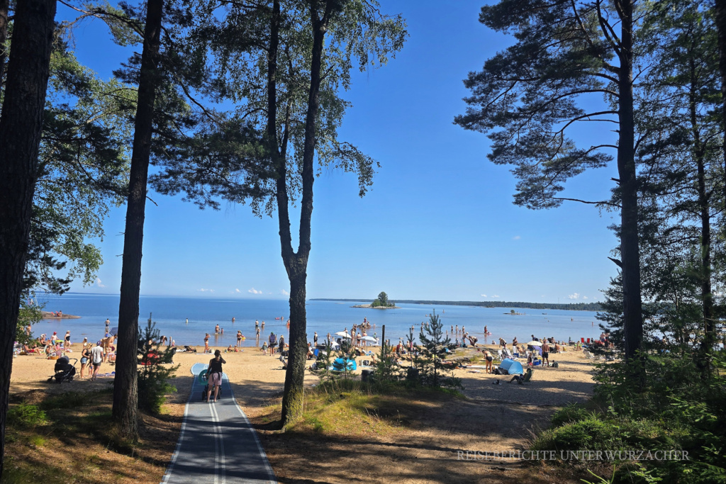 Nach dem ausgiebigen Frühstück geht es anschließend weiter zum „Vänern“, dem größten See des Landes. Nach 30 Kilometern erreichen wir den großen Parkplatz, der an diesem Mittwoch ziemlich gut gefüllt ist. Neben dem Übernachtungsverbot für Wohnmobile finden wir auch ansonsten fast keinen Platz. Hoffentlich ist wenigstens das Parken hier für Wohnmobile erlaubt? Der Weg durch den Wald ist kurz und dann öffnet sich uns der Blick auf das Badeparadies ….