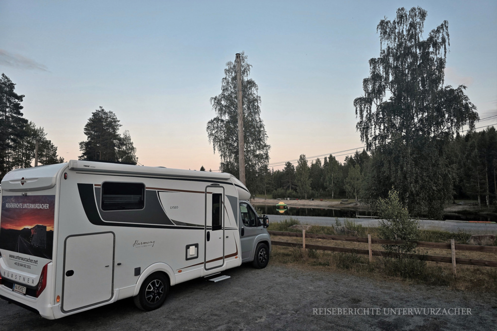 Unsere erste Nacht in Norwegen auf unserer diesjährigen großen Reise verbringen wir an einem Badesee in Saggrenda, unterhalb der Silbermine ca. 8 Kilometer außerhalb von Kongsberg.