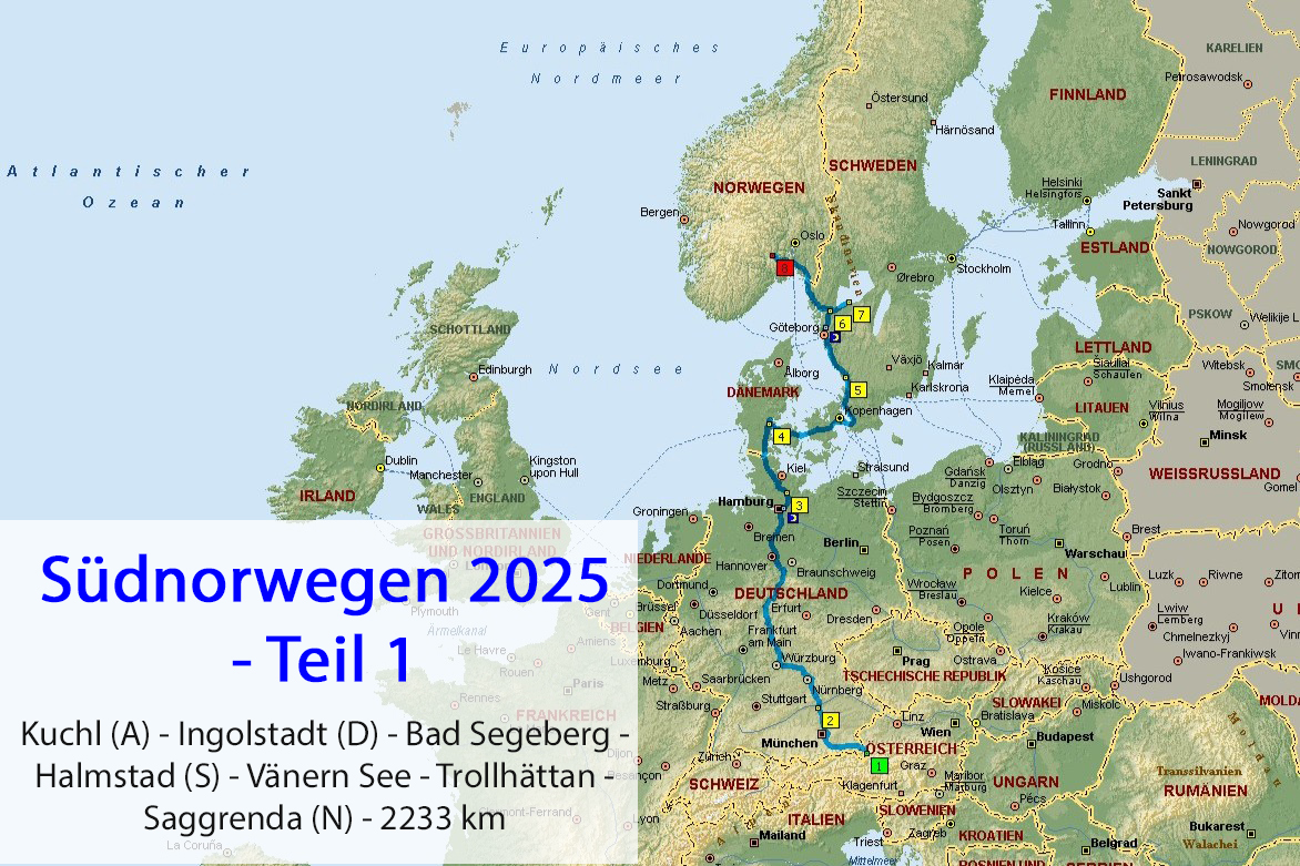 Teil 1: Kuchl (A) – Ingolstadt (D) – Bad Segeberg – über Dänemark und die Storebeltbrücke und Öresundbrücke nach Schweden – Halmstad (S) – Vänern See – Trollhättan – Saggrenda (N) – 2233 km