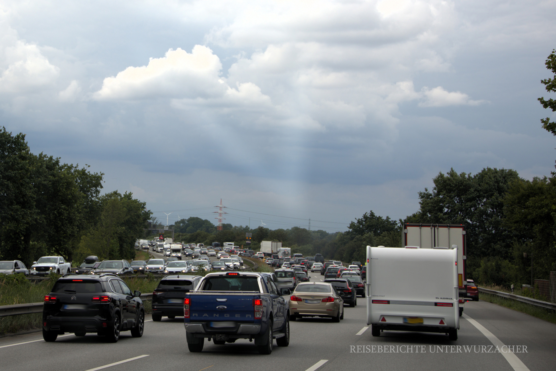 Erst bei Hamburg kommen wir in den unumgänglichen (?) Stau. Wegen Baumaßnahmen haben sie – unsere deutschen Nachbarn – gleich einen ganzen Autobahnabschnitt (A7) in beide Richtungen gesperrt. Der Stau durch Hamburg ist dementsprechend ausgiebig und langatmig. Gemütlich wollten wir die Reise angehen, aber es muss nicht unbedingt ein stundenlanger Stau sein …