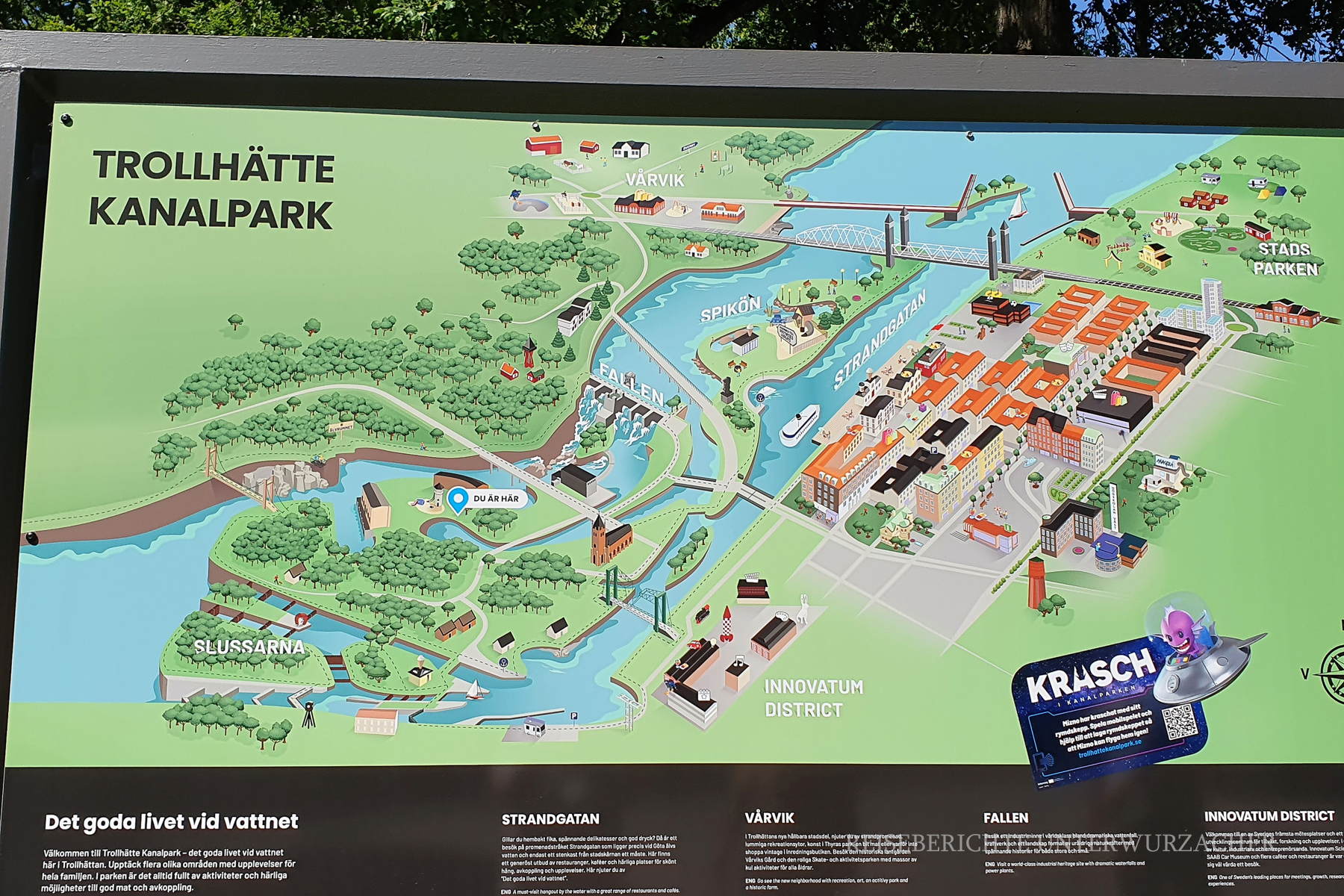 Erst nach dem Mittagessen setzen wir unsere Reise fort. Wir fahren am Meer entlang nach Norden und parken am späteren Nachmittag in Trollhättan. Hier soll es Wasserfälle, Schleusen, Wanderwege und viel Natur geben. Schon auf YouTube hat mir diese Gegend sehr gut gefallen. Der ausgeschilderte Wohnmobil-Stellplatz ist bei unserer Ankunft bereits voll belegt. Macht aber gar nichts – die Wohnmobile stehen auf den ca. 10 Plätzen wirklich sehr eng beieinander. Da die begradigten Plätze bereits ausgelastet sind, stellen wir uns etwas weiter runter auf den PKW-Parkplatz. Der ist zwar einigermaßen schräg und es stellt sich etwas später auch ein Kastenwagen direkt neben uns – und auf der anderen Seite gesellen sich im Laufe des Abends noch zwei Wohnmobile, ebenfalls ziemlich eng an uns gekuschelt, in die nette Runde.