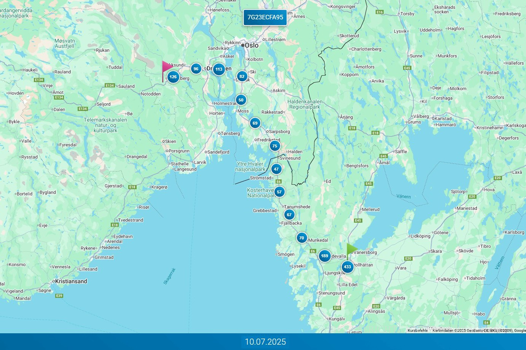 Kuchl (A) – Ingolstadt (D) – Bad Segeberg – über Dänemark und die Storebeltbrücke und Öresundbrücke nach Schweden – Halmstad (S) – Vänern See – Trollhättan – Saggrenda (N) – 2233 km