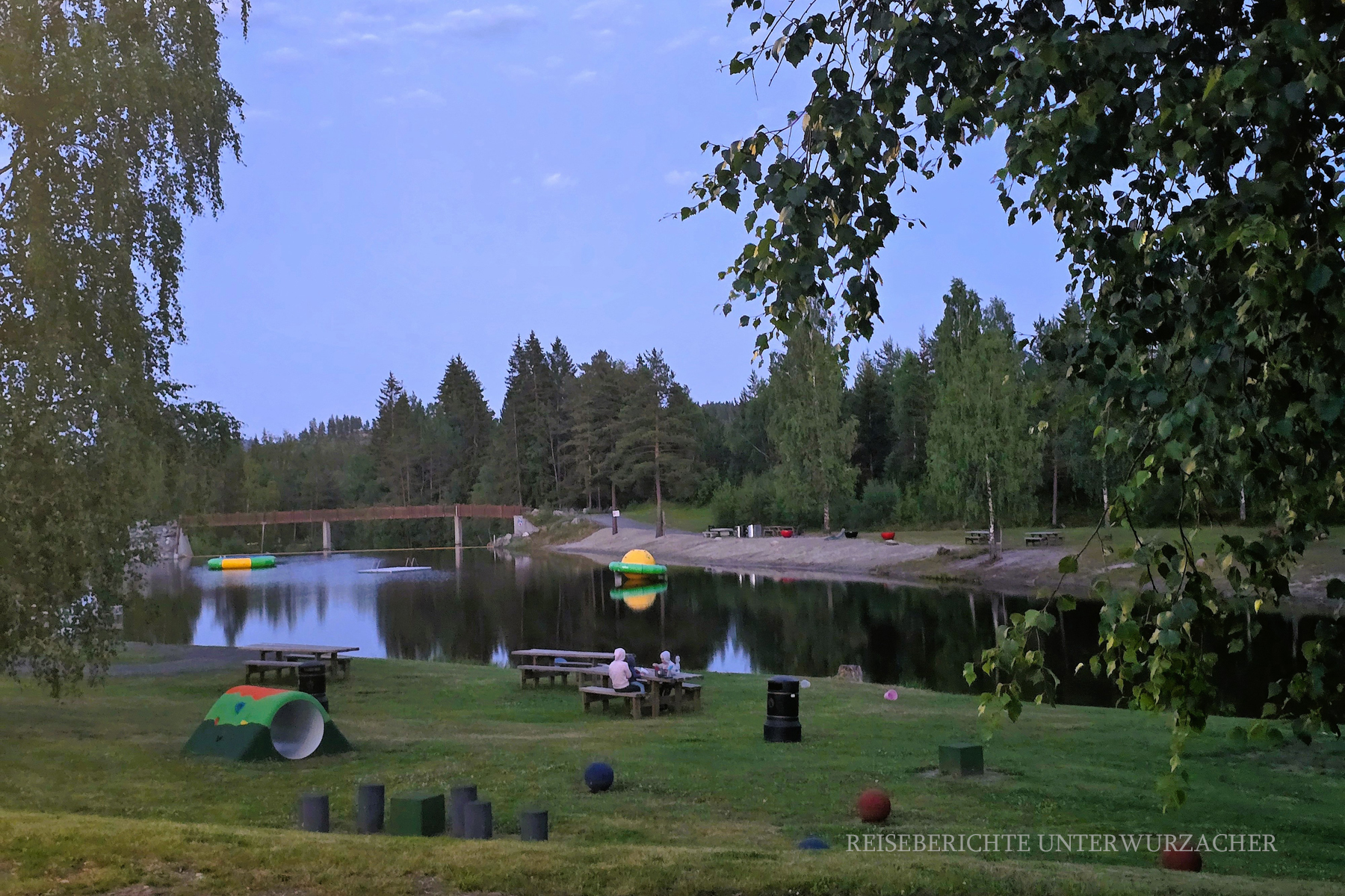 Besser hätten wir es aus unserer Sicht nicht erwischen können: Schöner Badesee (aufgestauter Fluss), neu hergerichteter Stellplatz mit ausreichend Platz, unterhalb der Silbermine und alles noch dazu kostenlos. Wir genießen die Ruhe und freuen uns über die gelungene Ankunft in Südnorwegen …